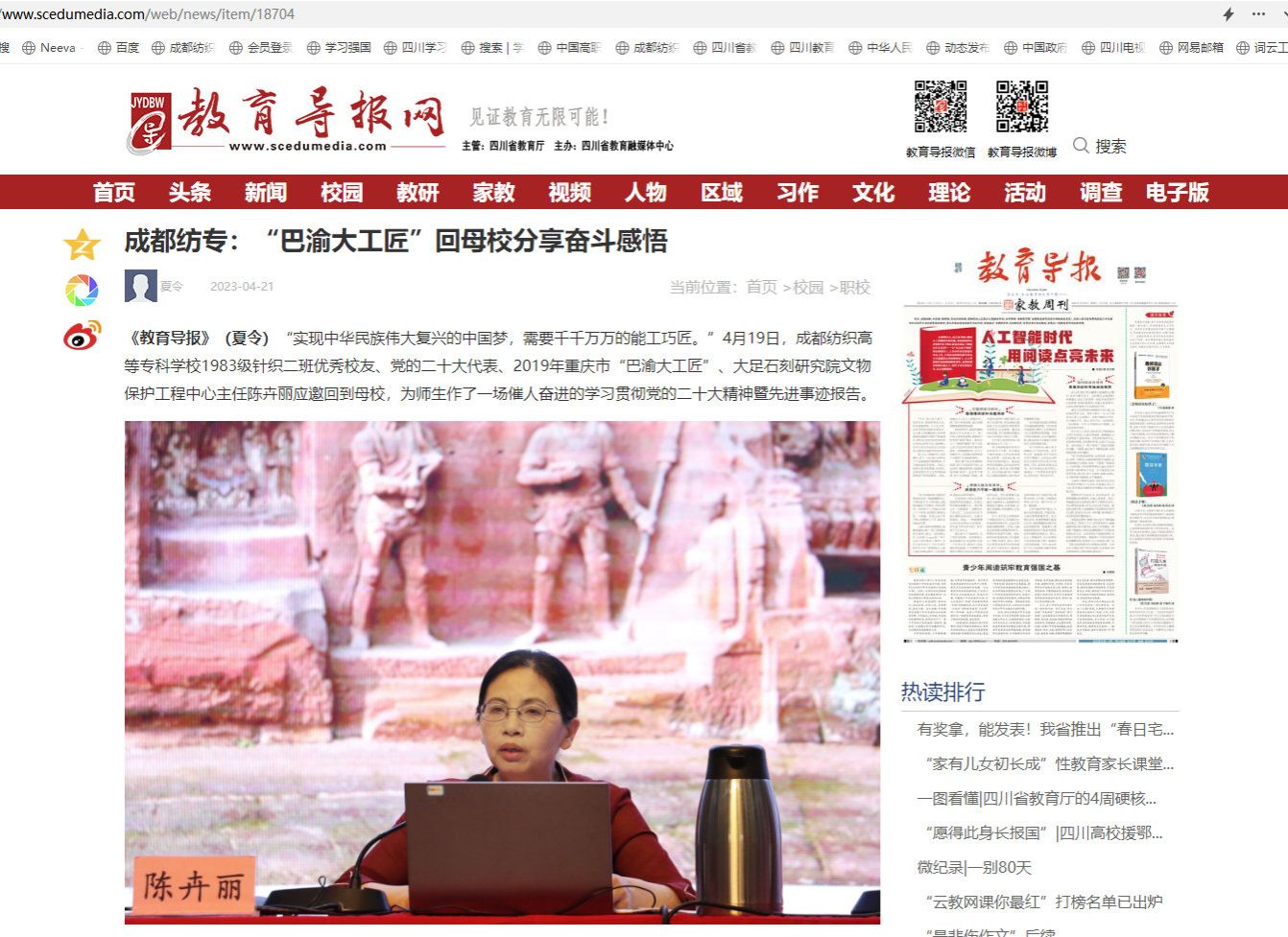 《教育导报》(夏令)“实现中华民族伟大复兴的中国梦,需要千千万万的能工巧匠。”4月19日,成都纺织高等专科学校1983级针织二班优秀校友、党的二十大代表、2019年重庆市“巴渝大工匠”、大足石刻研究院文物保护工程中心主任陈卉丽应邀回到母校,为师生作了一场催人奋进的学习贯彻党的二十大精神暨先进事迹报告。